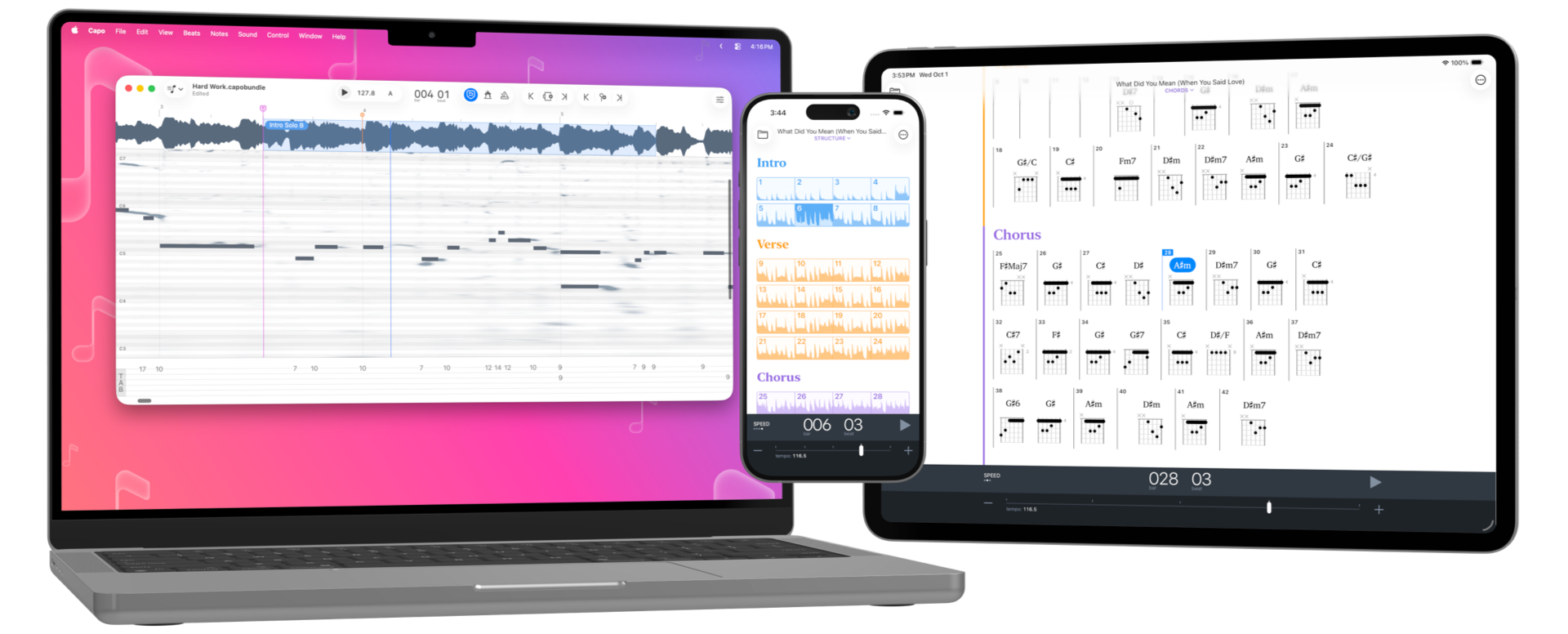 The best musicians train their ears by learning the songs they love. Capo makes this possible by analyzing any song in your music library to reveal its beats, chords, and key. No curated lessons, no prescribed curriculum—just you, your favorite music, and a tool that helps you hear what's really happening.