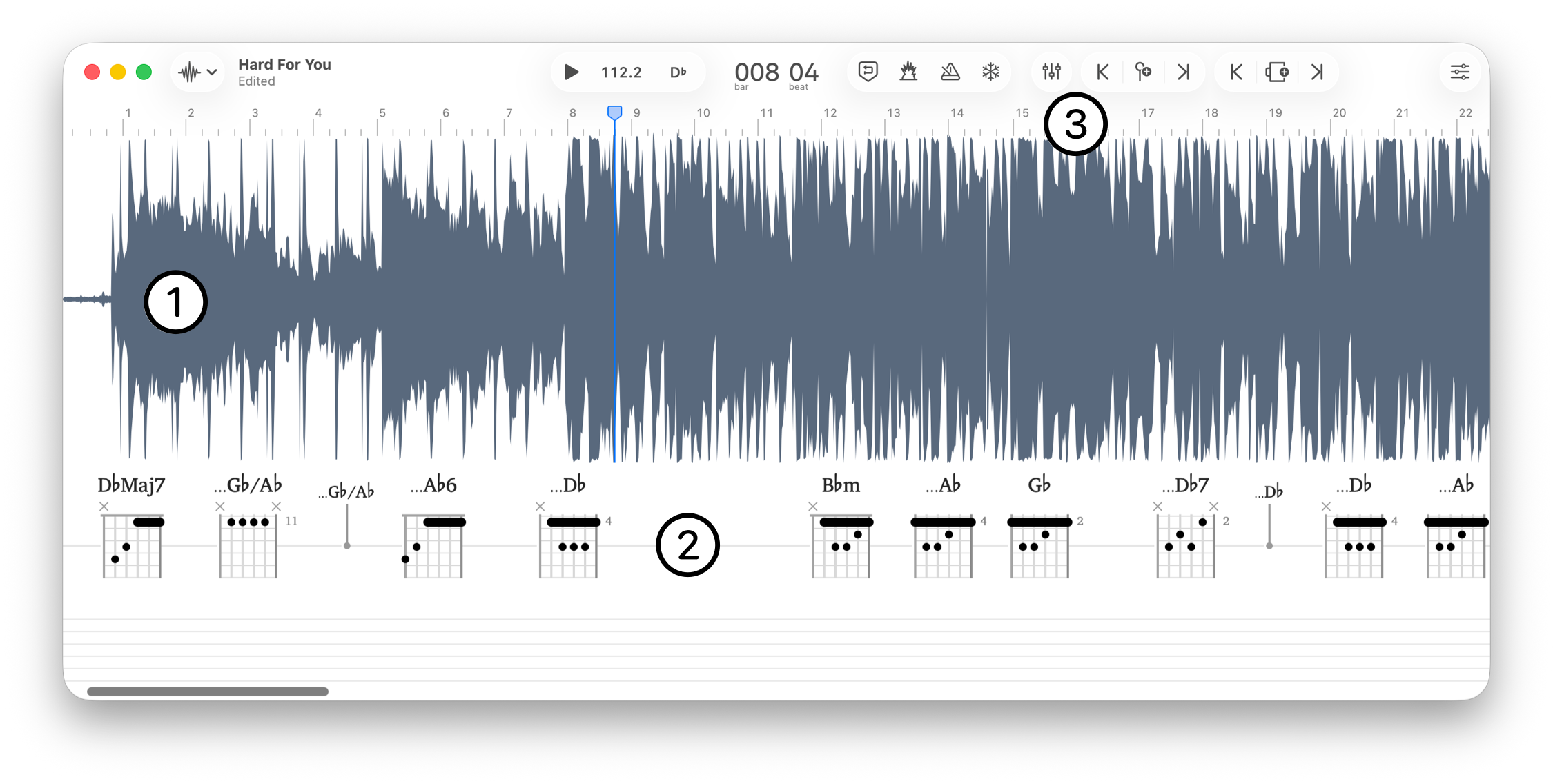 - The waveform ① visualizes the song's audio—louder parts are taller, quieter parts are shorter. The vertical line running through the waveform is the playhead—it shows where you are in the song.