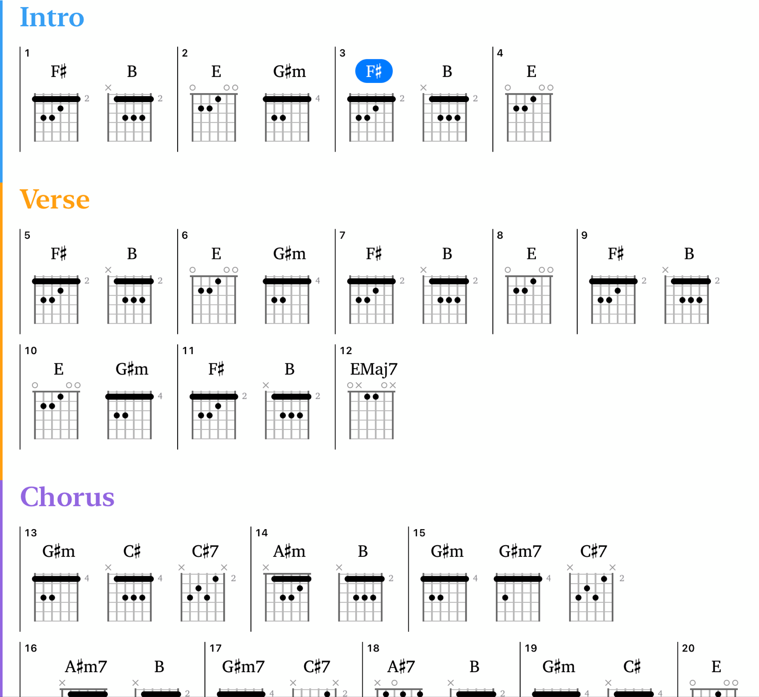 Chord-oriented musicians will appreciate the compact overview that the Chords song view brings to Capo. This view displays the chords in your song, organized by the sections and bars that you defined in the Structure Song View.