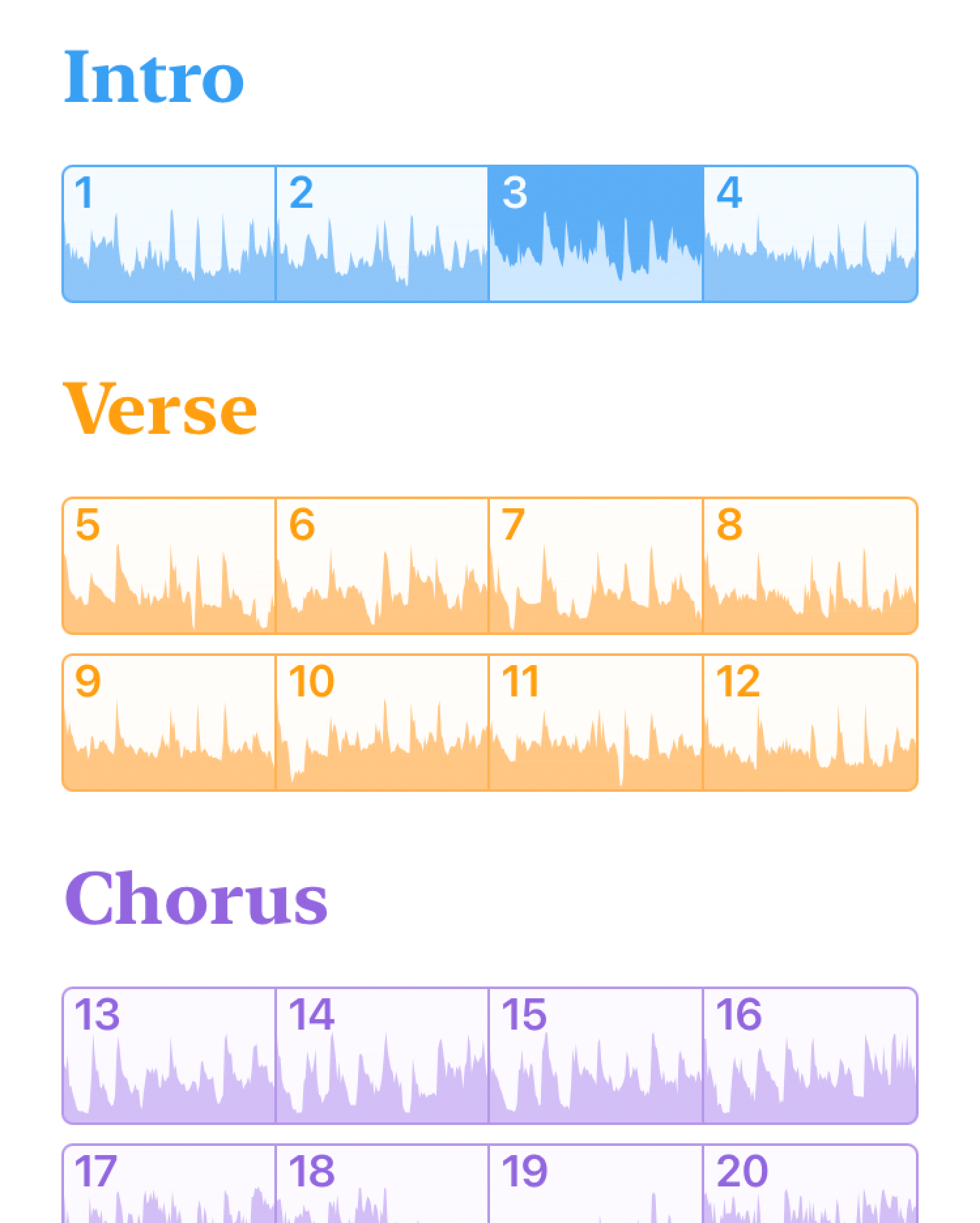 (Almost) all songs contain one or more sections consisting of bars of one or more beats. The Structure song view displays an overview of the song where you can interact with these elements.
