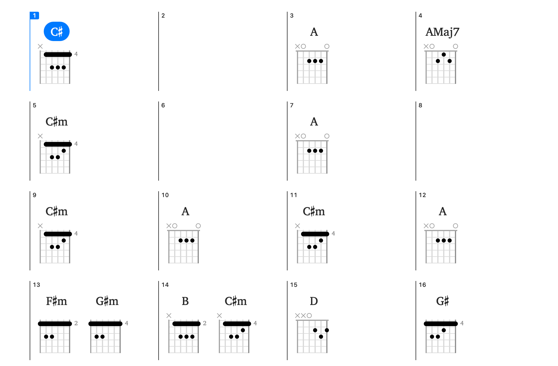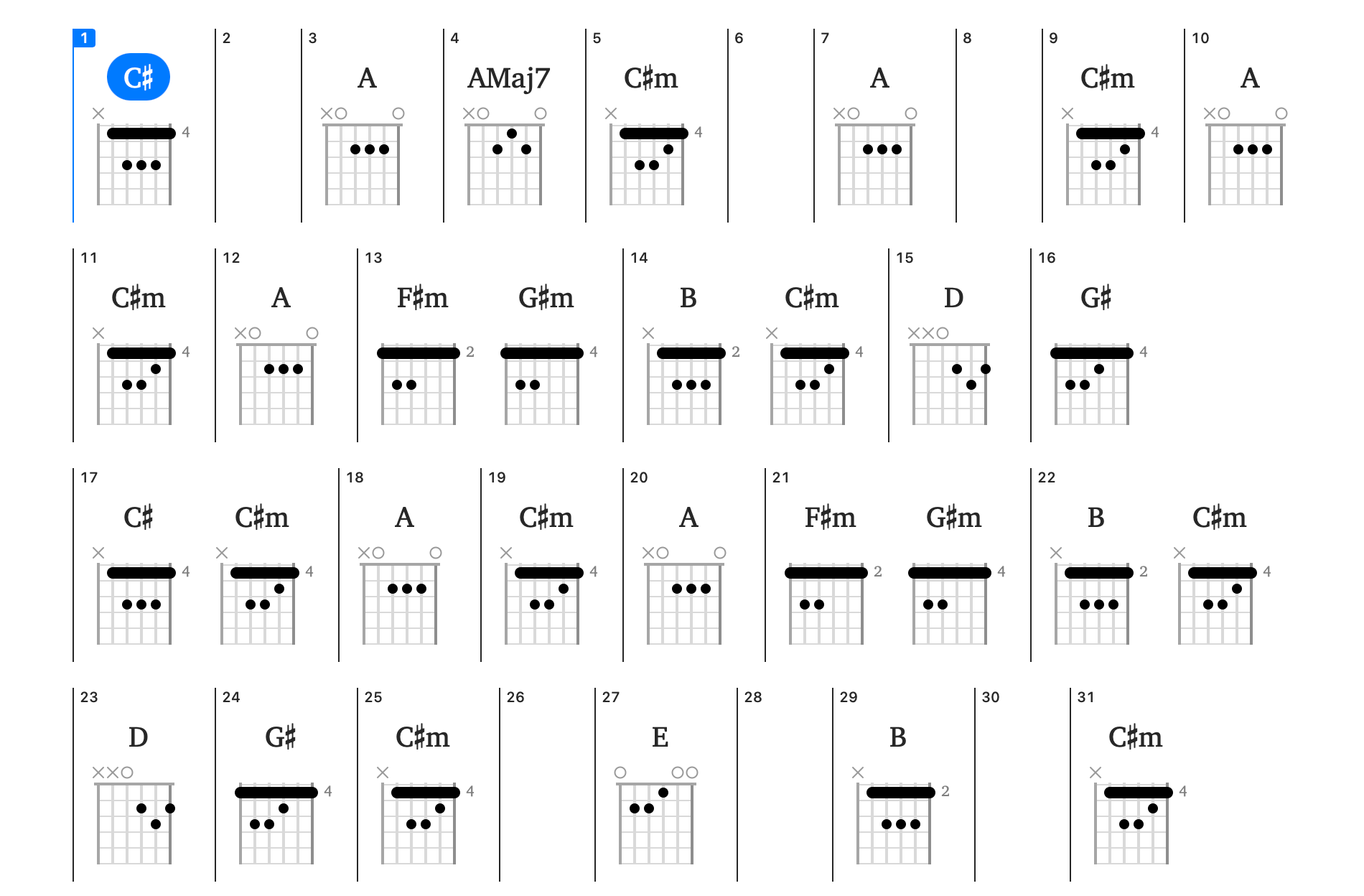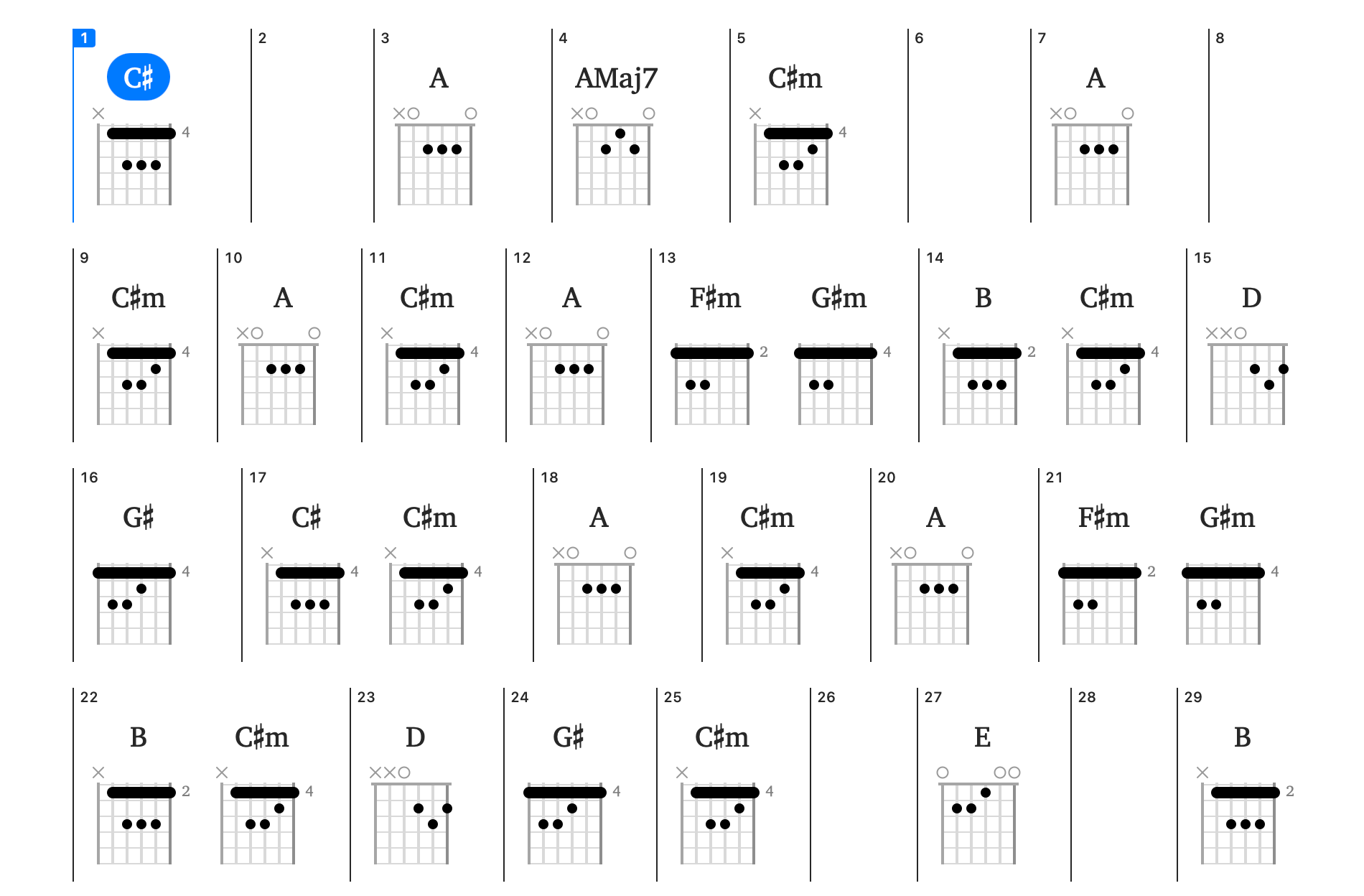 Chord-oriented musicians will appreciate the compact overview that the Chords song view brings to Capo. This view displays the chords in your song, organized by the sections and bars that you defined in the Structure Song View.