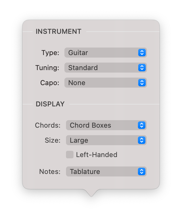 Different tunings are available for each instrument available. By adjusting the tuning of your instrument, the chord shapes shown in the In-Song View will be adjusted accordingly.