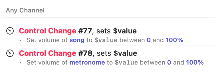 Note: In this example configuration, we set all of the bindings to match incoming MIDI messages on any channel. This may not be the correct choice for your hardware, especially if you have many MIDI devices attached at the same time, and you don't want commands to trigger unexpectedly. If you're worried about this happening, be sure to specify a channel for your MIDI message triggers. Use the learning feature in the MIDI Message Editor if you aren't sure what to specify here.