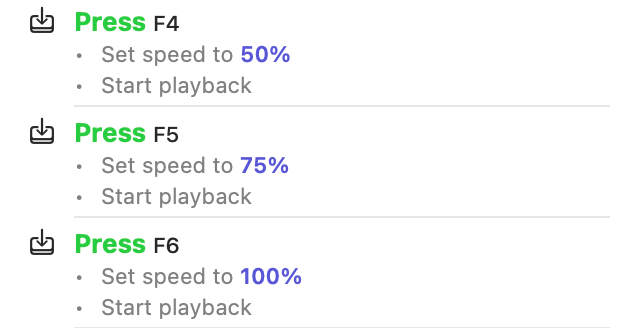 In Capo, a binding can dispatch more than one command. For example, pressing the F4 key could set the playback speed to 50%, and then start playback. Pressing the F5 key could do the same, but at 75% speed, and the F6 key at 100%. These bindings would give you one-touch access to start playback at a preset speed–especially handy when used alongside the transcription playhead.