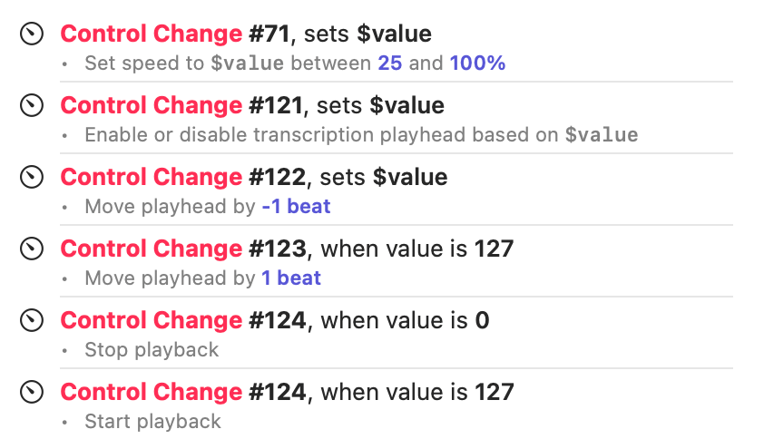 Some commands let you specify variable parameter values, where you let Capo "fill in the blanks" using incoming values from value-carrying MIDI messages. For example, you can set the playback speed using a variable, where values between 0 and 127 (the full range of MIDI values) are translated to a value between 25 and 150%. However, you might not want to set the speed across such a wide range. Fortunately, you can configure Capo to apply this translation over a smaller range, like 50-100%. You can also use variables to change parameters that accept boolean true or false values, like whether or not playback is active, as you'll see in our example configurations.