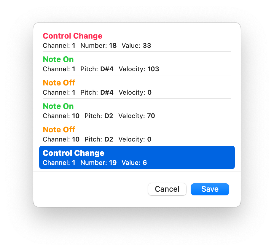 In the Learning MIDI Message Chooser, you can interact with controls on your MIDI hardware–knobs, sliders, keys on a keyboard, or drum pads–and the list of MIDI messages will update and select the last message that was received. When interacting with knobs and sliders, the item remains selected in the list with updates to its value to reflect what you're doing with the MIDI hardware.
