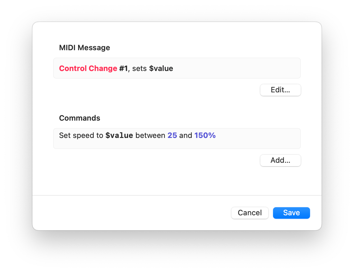 When you create or edit a MIDI binding, you choose a MIDI message, and a list of commands that get triggered when the message is received.