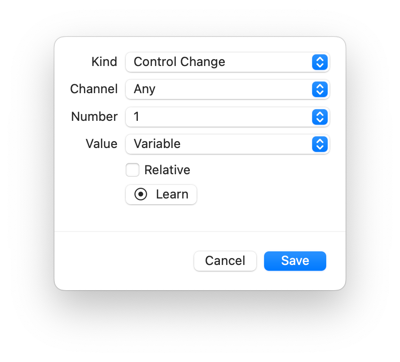 - Open the Learning MIDI Message Chooser