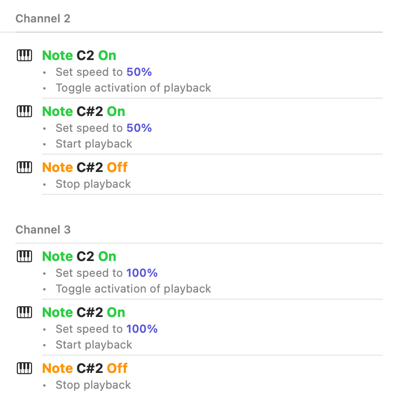 With this configuration, the first pad will trigger playback at 50% speed in bank 2, and 100% speed in bank 3. The second pad plays audio at its preset speed only while the pad is held down, which is especially useful when the transcription playhead is active.