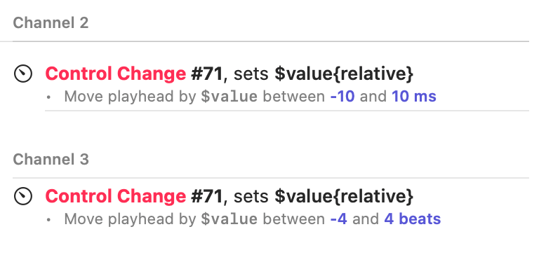When the knob is activated on the second bank, the playhead is moved by somewhere between -10 and 10 milliseconds, which is a very fine adjustment. Depending on your own MIDI hardware, you might want to play with this range until it feels right to use. On the third bank, the playhead will move much more quickly, aligned with the beat grid, as you turn the knob.